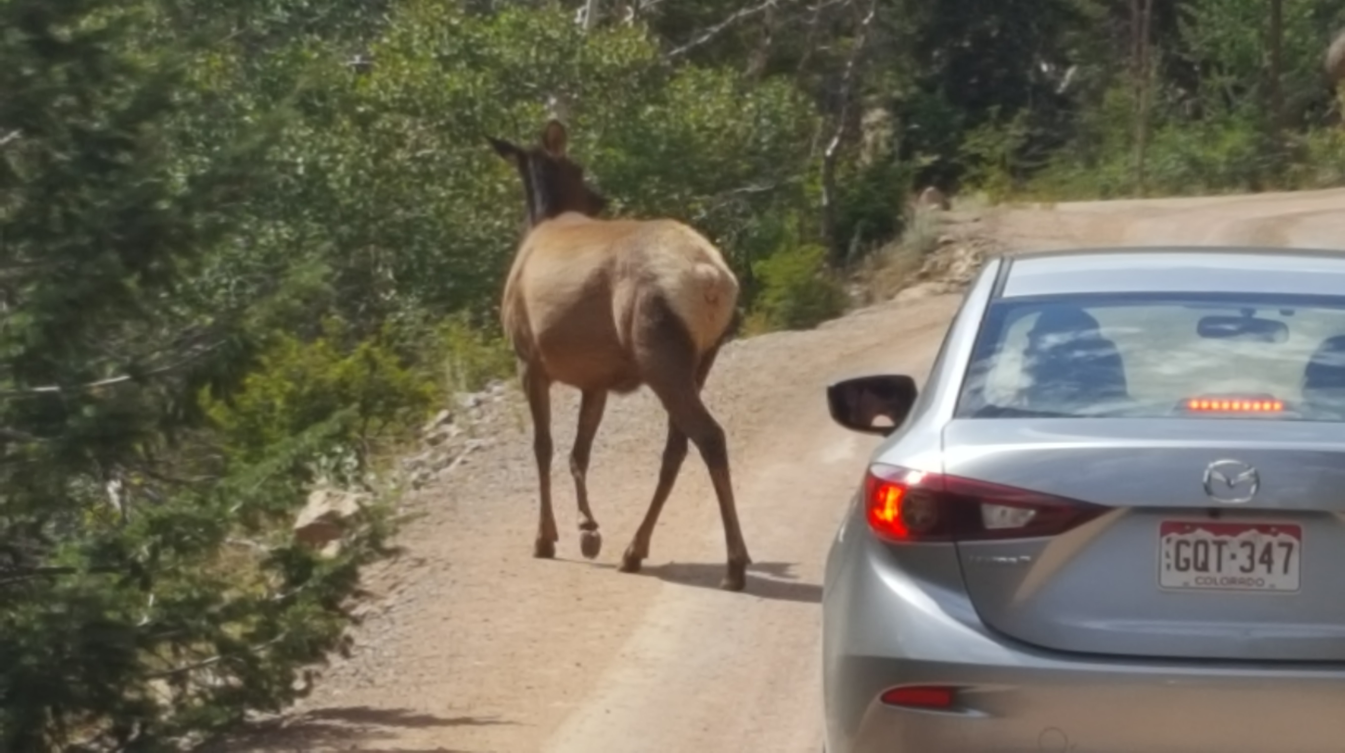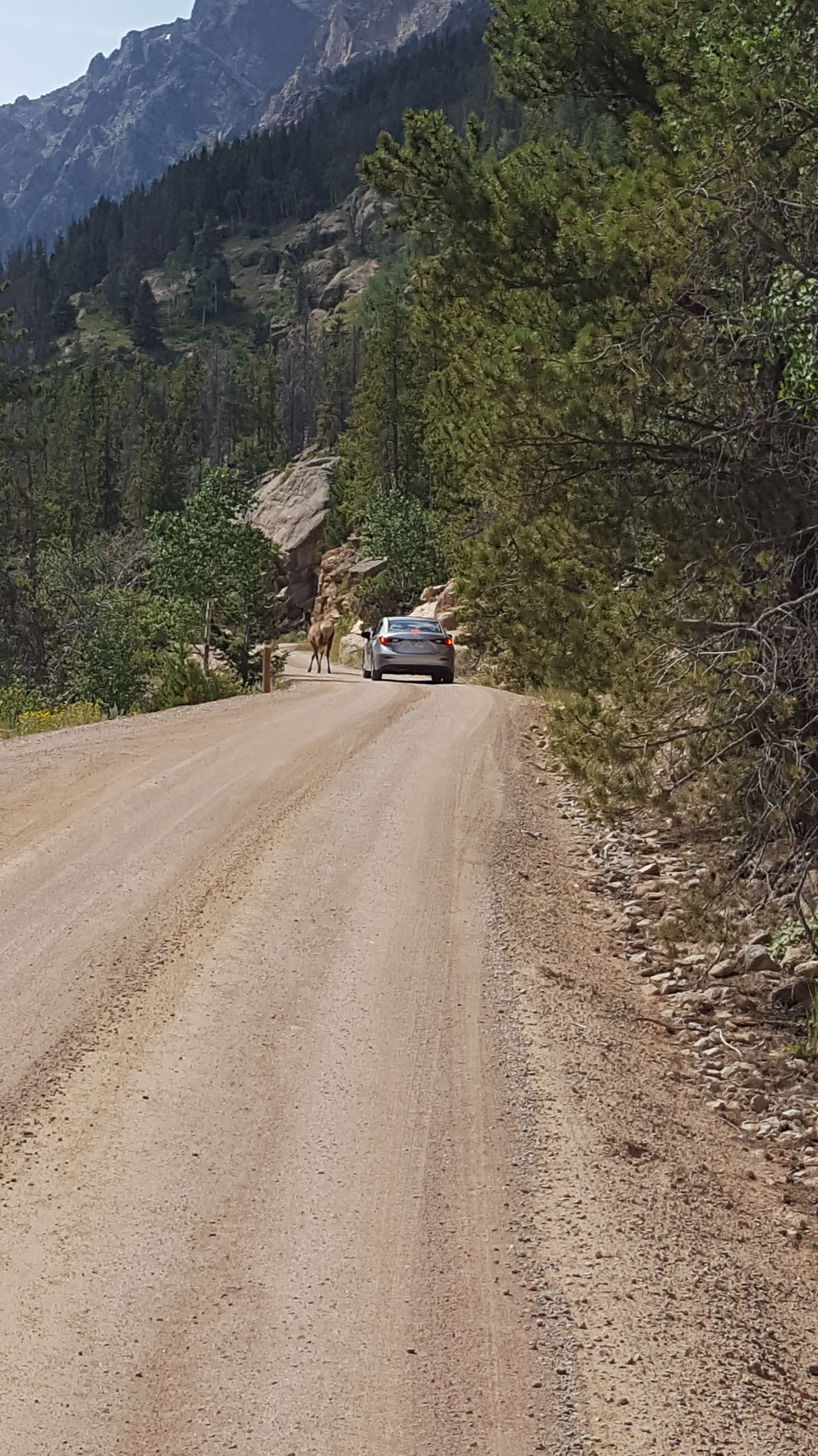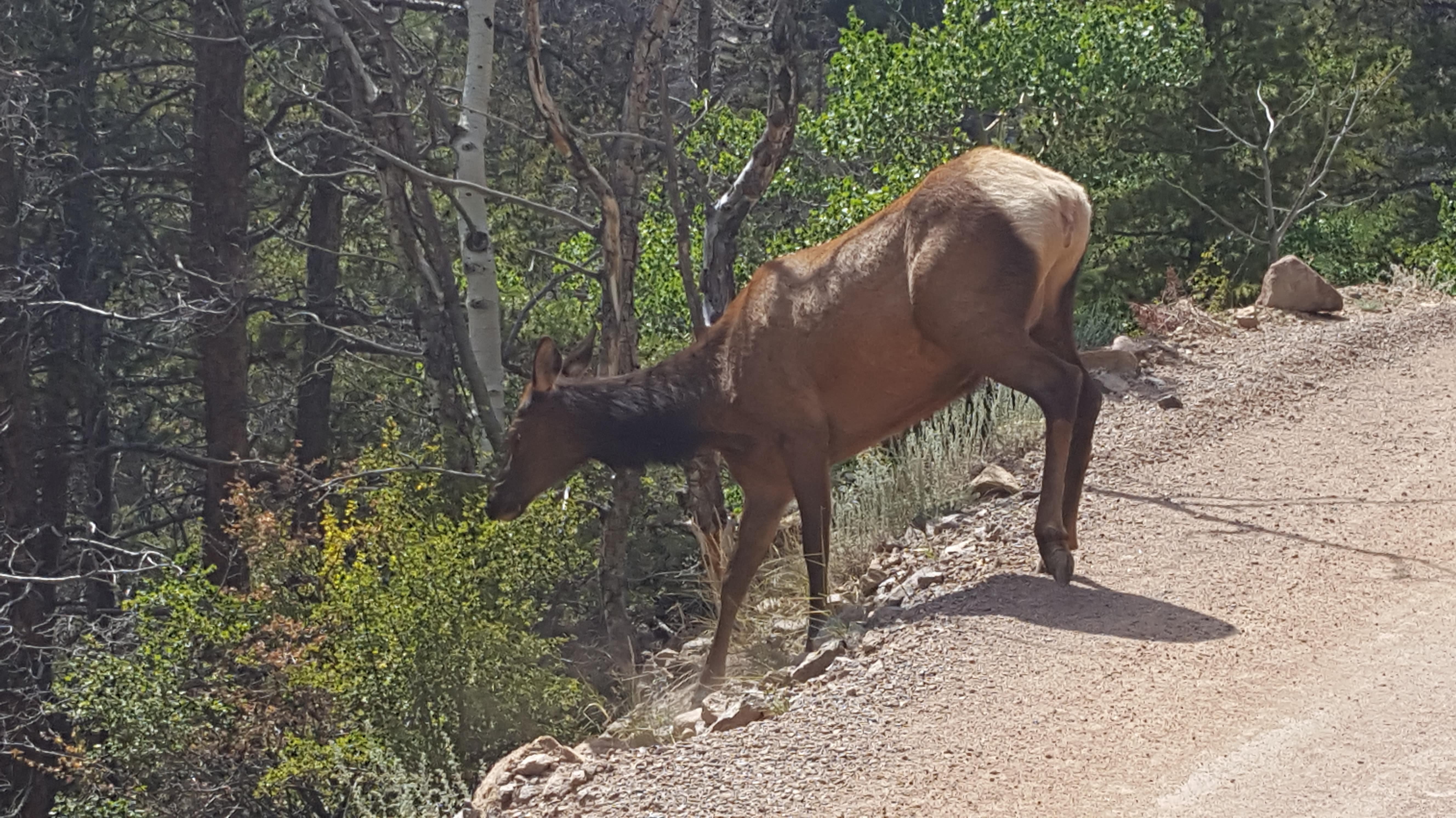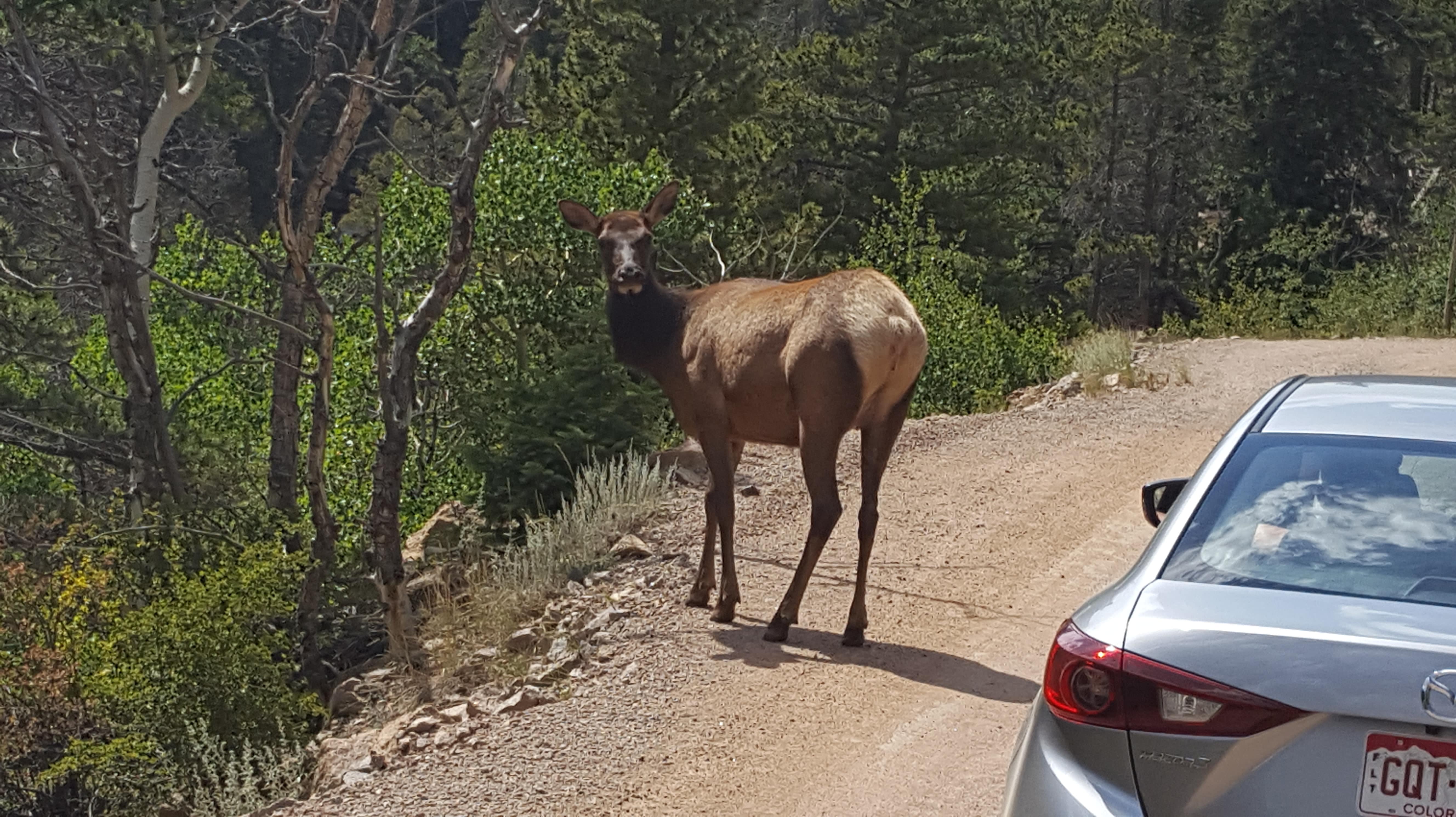 We got a nice surprise. As we rounded a curve, right up ahead was an elk!