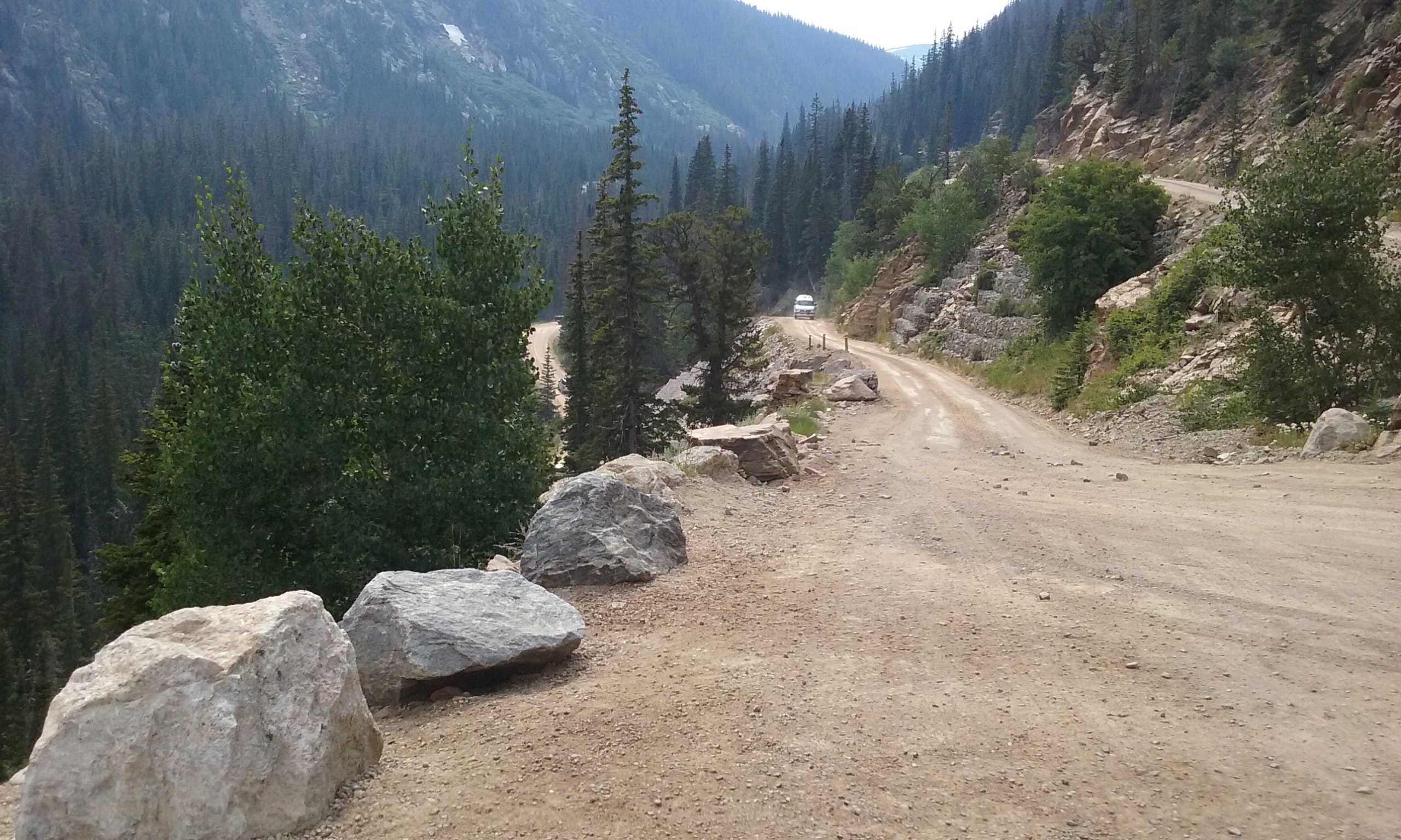 It’s a one-way, narrow, speed limit of 15 mph, winding with hairpin turns, dirt/rock, awesome mountain road!