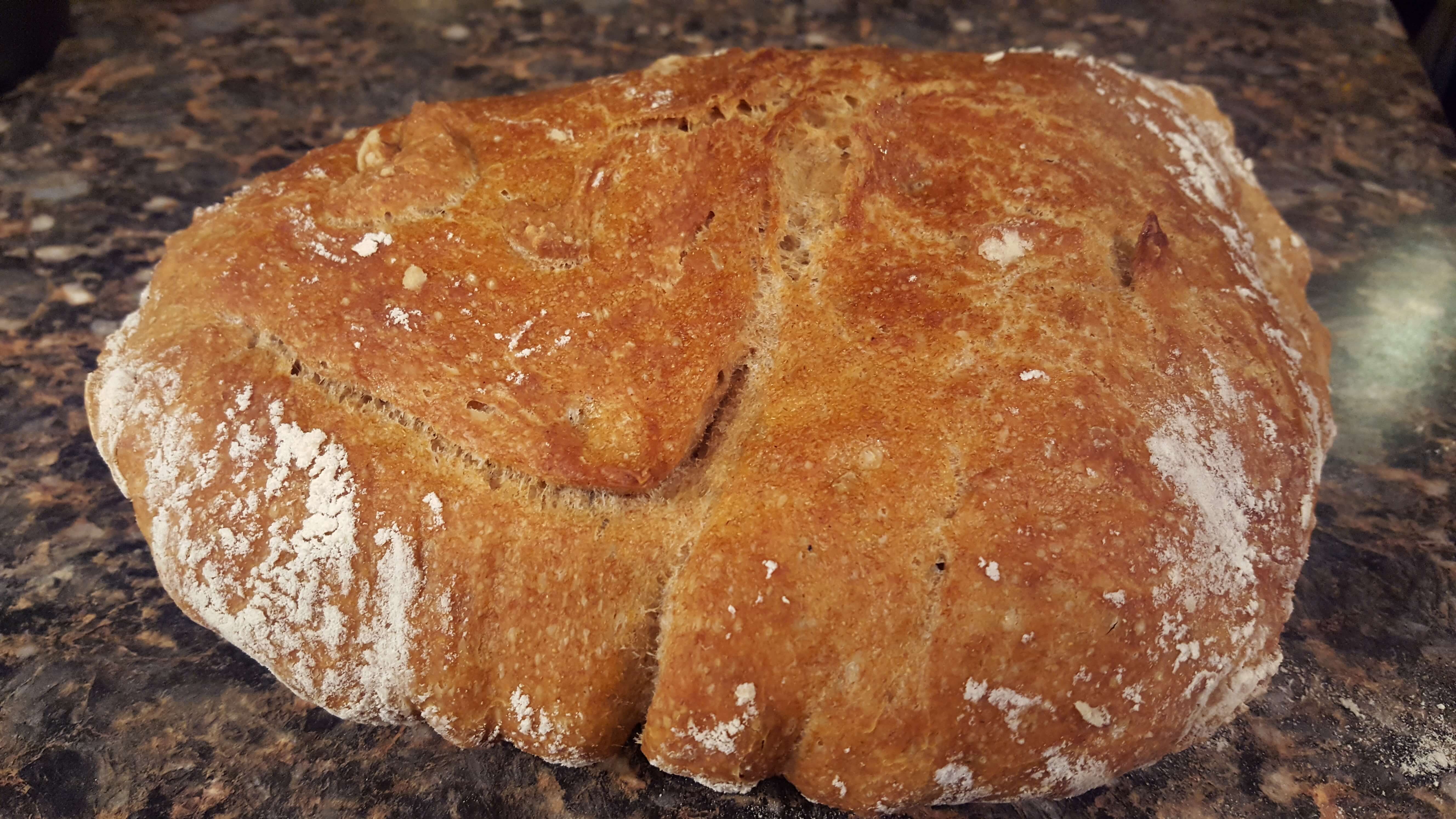 The last 1/2 hour (of the 2 hours) turn oven on to 425 degrees and put the empty dutch oven with the lid into your oven. When the dough has risen for the 2 hours, take the pan out of the oven and put the dough in–seam side up (if possible). Bake with the lid on for about 30 minutes, then take lid off and continue baking for about 20 minutes more. Bread should be golden and very crusty! Enjoy with lots of butter…or not. 🙂