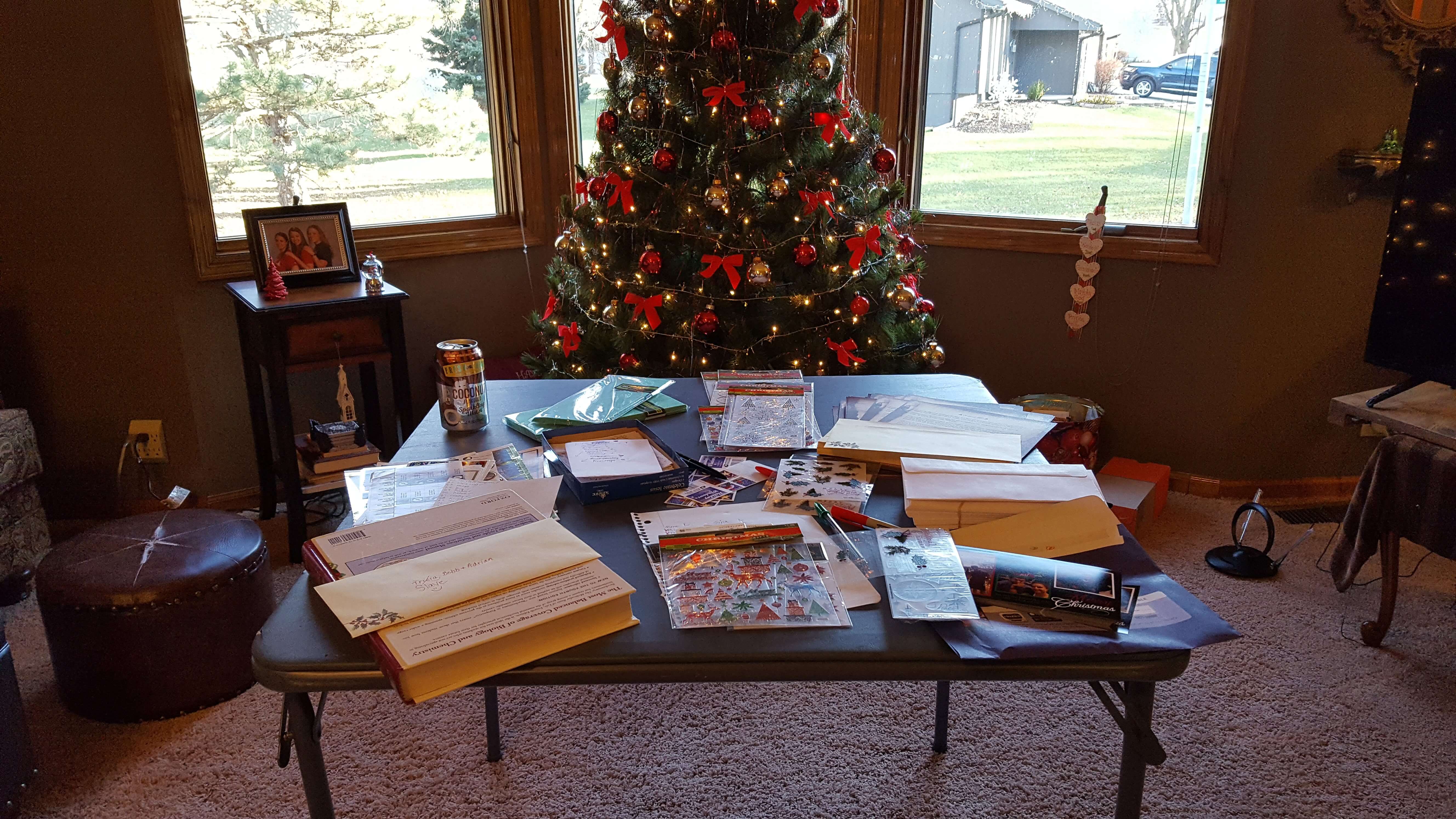 The choosing of a family picture for the Christmas photo card, the drafting of the Christmas letter, putting it all together to proclaim the season. Fun! Too much time is probably spent choosing just the right stamp, sticker, and address label to create a Christmas delight, but I like the card to be a present in itself.