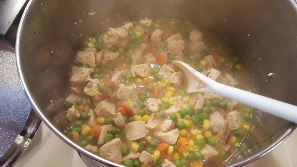 - When chicken is no longer pink, add broth and frozen veggies. Cook about 15 minutes.