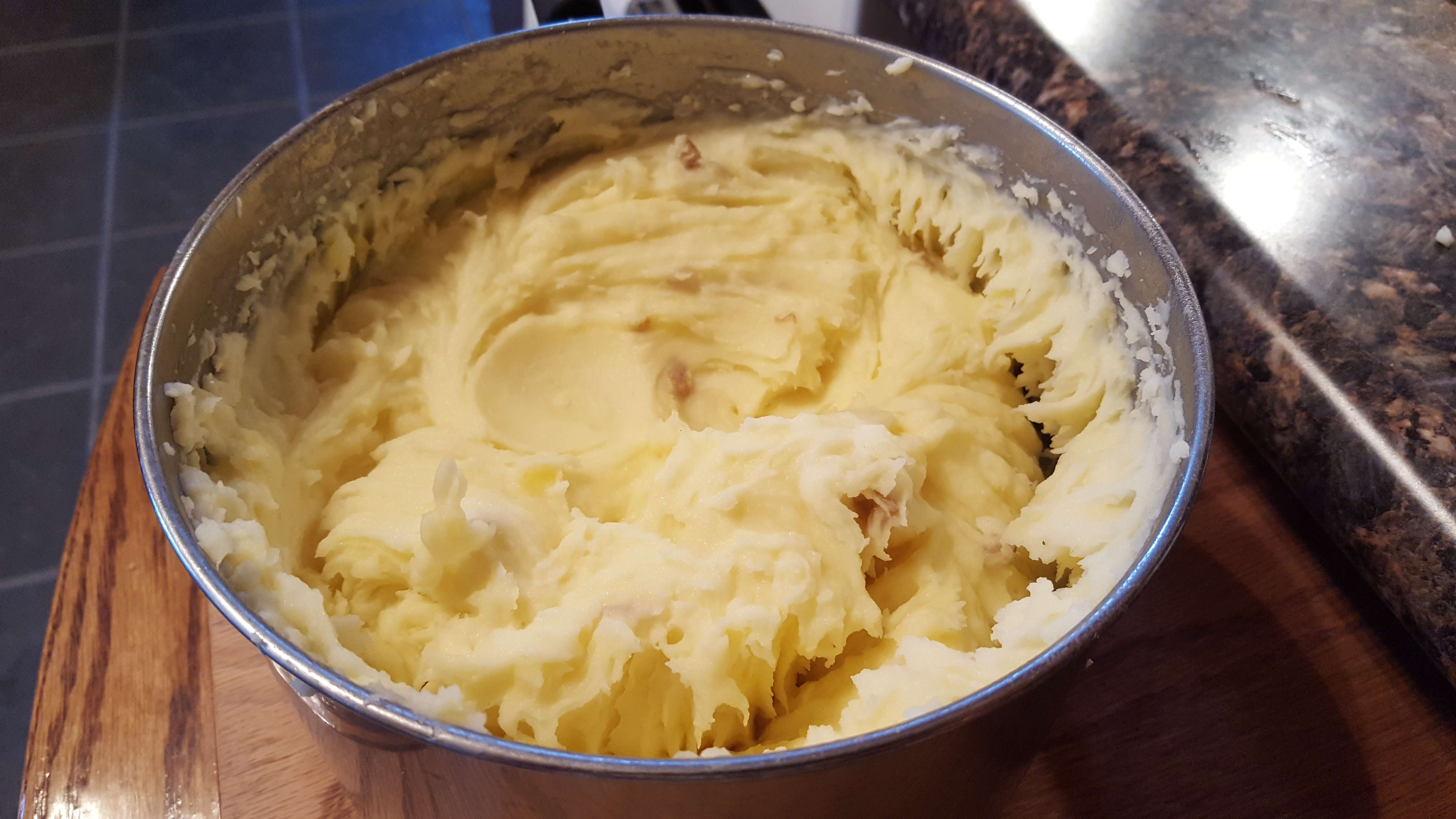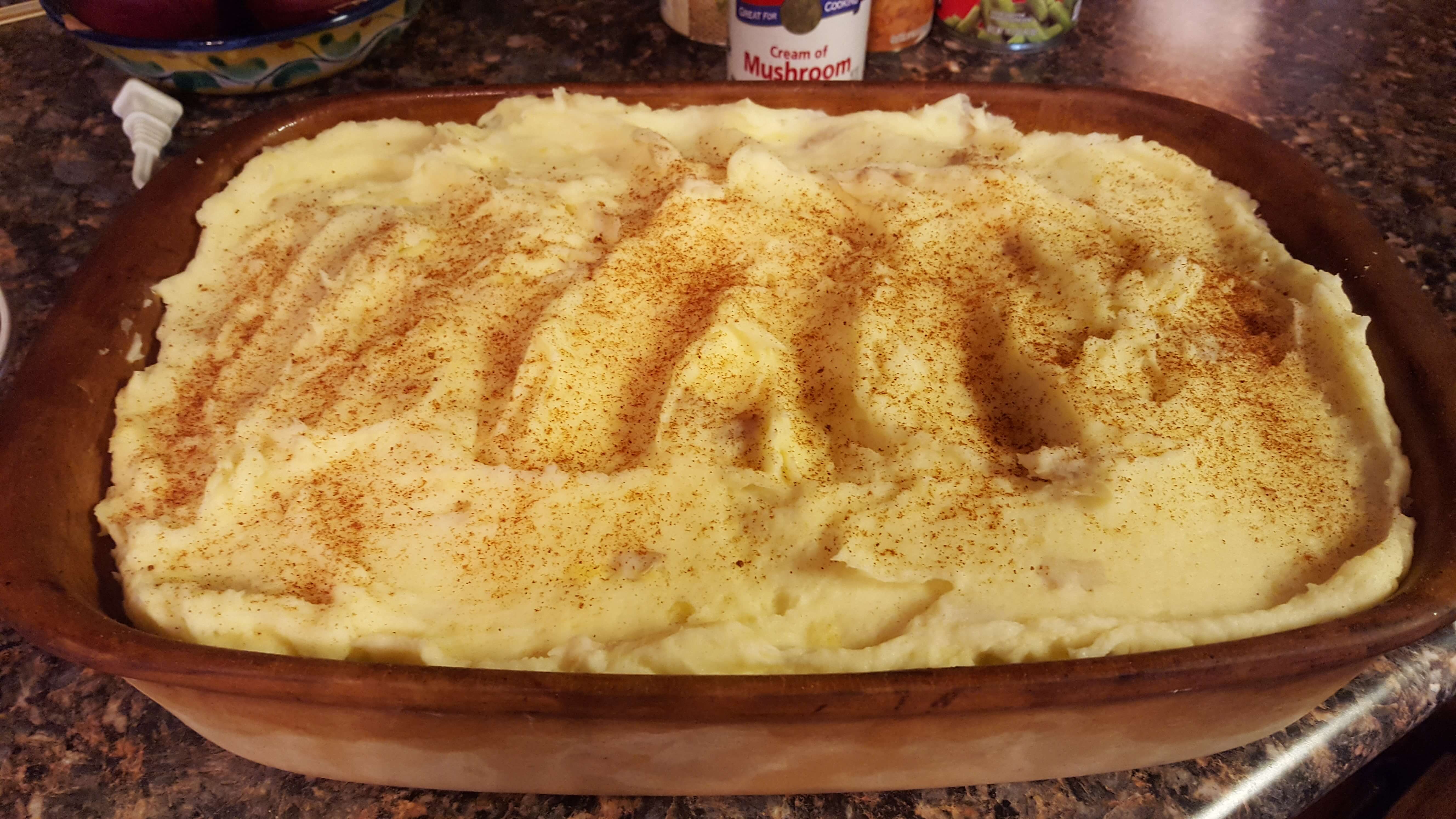 Mash/beat the potatoes making them nice and creamy. I use sour cream, salt, and butter. Spread over the mixture; it is kind of like frosting a cake.